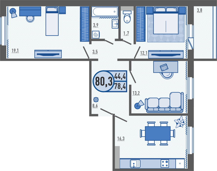3-комнатная квартира 80.3 м²